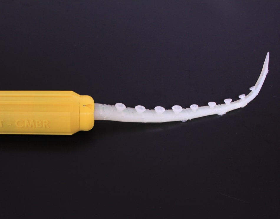 Like an octopus arm, has a conical shape, and is entirely soft. It embeds a cable-driven actuation and a microfluidic network.
